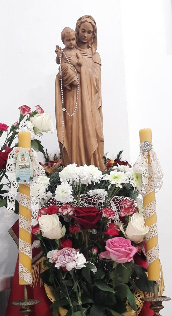 W dniu 26 października w niedziele Roku Pańskiego 2025 w Święto Pana Naszego JEZUSA CHRYSTUSA KRÓLA został Uroczyście otwarty Żywy Różaniec. Podczas Ofiary Mszy Świętej śpiewanej i na spotkaniu zostały zapalone od Kawalerówi, Panów, Pannien i Pań stowarzyszonych w Żywym Różańcu dwie uroczyście przystrojone świece przy Statule Matki BOŻEJ Królowej Różańca Świętego. Także w środku kolumny i przy Statule Matki BOŻEJ Królowej Różańca Świętego zostały ustawione piękne kwiaty na Cześć MATKI BOŻEJ naszej Najdroższej Królowej Różańca Świętego; w tym Róże w różnych kolorach symbolizujące Tajemnice Różańcowe; u dołu fotografia z uroczystego otwarcia Żywego Różańca.